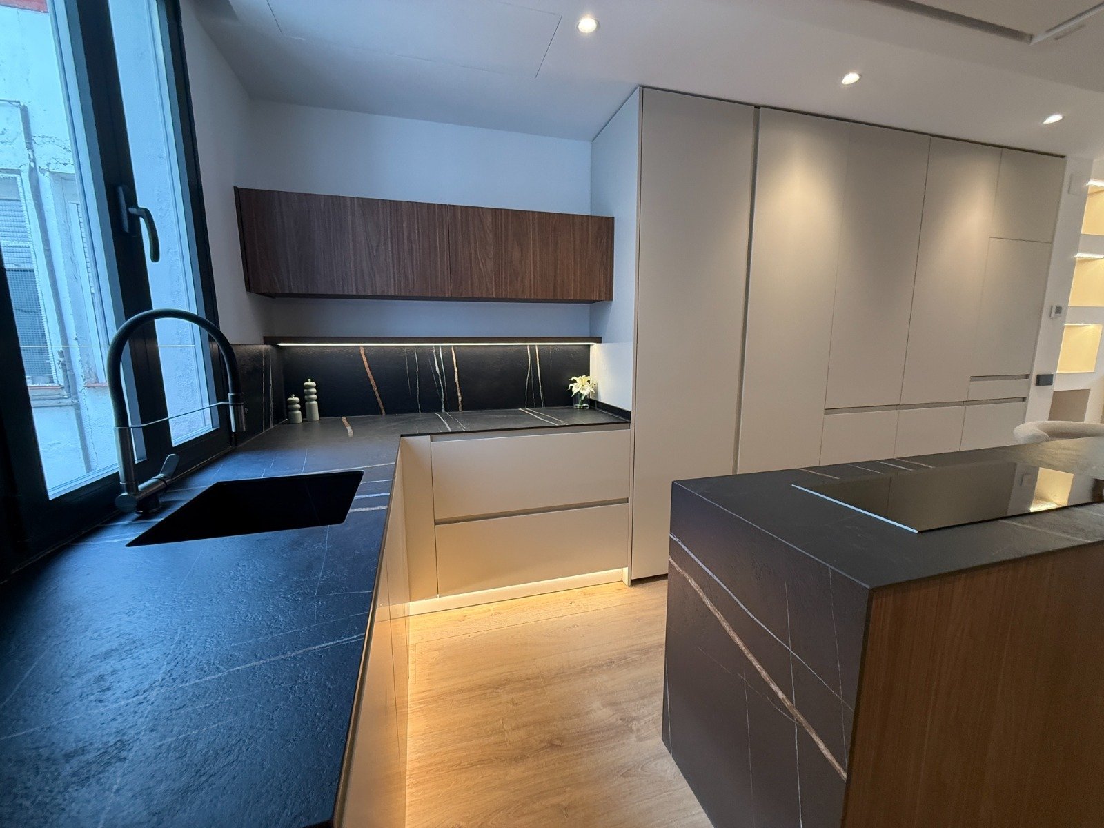La cocina, perfectamente integrada en el conjunto, combina diseño actual y practicidad, adaptándose a un estilo de vida moderno y exigente.